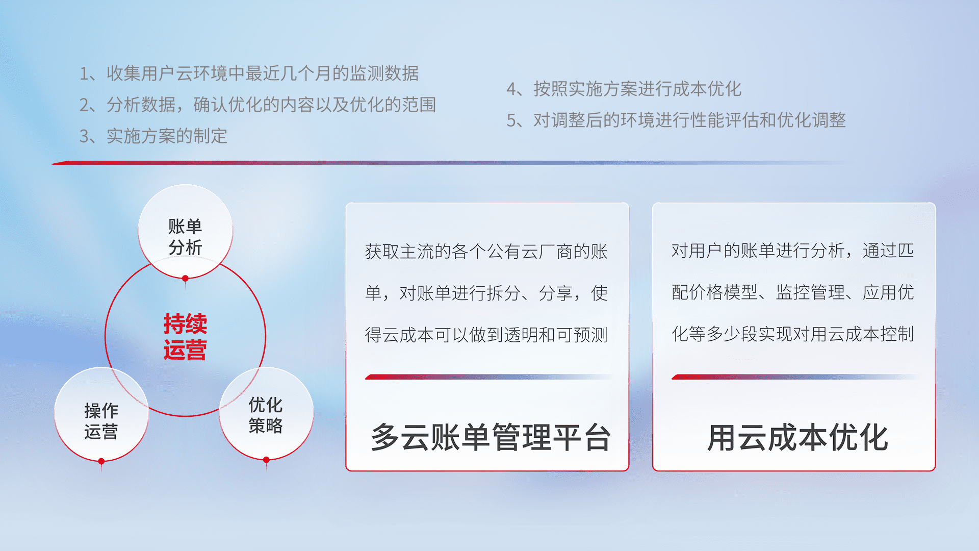 通过多云纳管,,,以统一的资源数据模型把客户的云资源进行抽象和封装,,,进而实现对多云资源的统一操作,,,保障云资源管理的可靠性、、、稳定性与可用性。。量身定制化运维内容,,配置、、、、开发运维、、、、补丁管理、、、备份、、、、监控、、认证和访问管理、、审计和日常巡检等,,保障在用云过程中的可靠度,,,,稳定度以及高可用率。。。