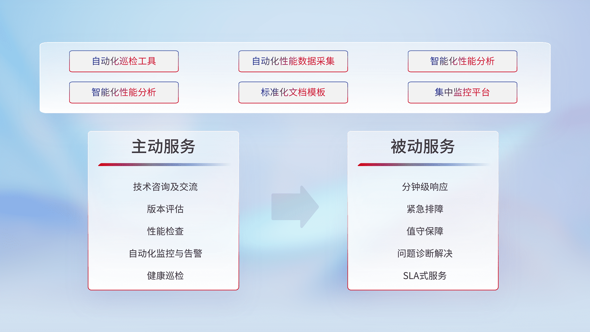 智能化工具和标准化文档,,,保障服务质量,,,提供主动服务(包含技术咨询、、版本评估、、、性能检查、、、、自动化监控与告警、、、健康巡检)和被动服务包含(分钟级响应、、紧急排障、、、值守保障、、、问题诊断解决、、、SLA服务)。。。。