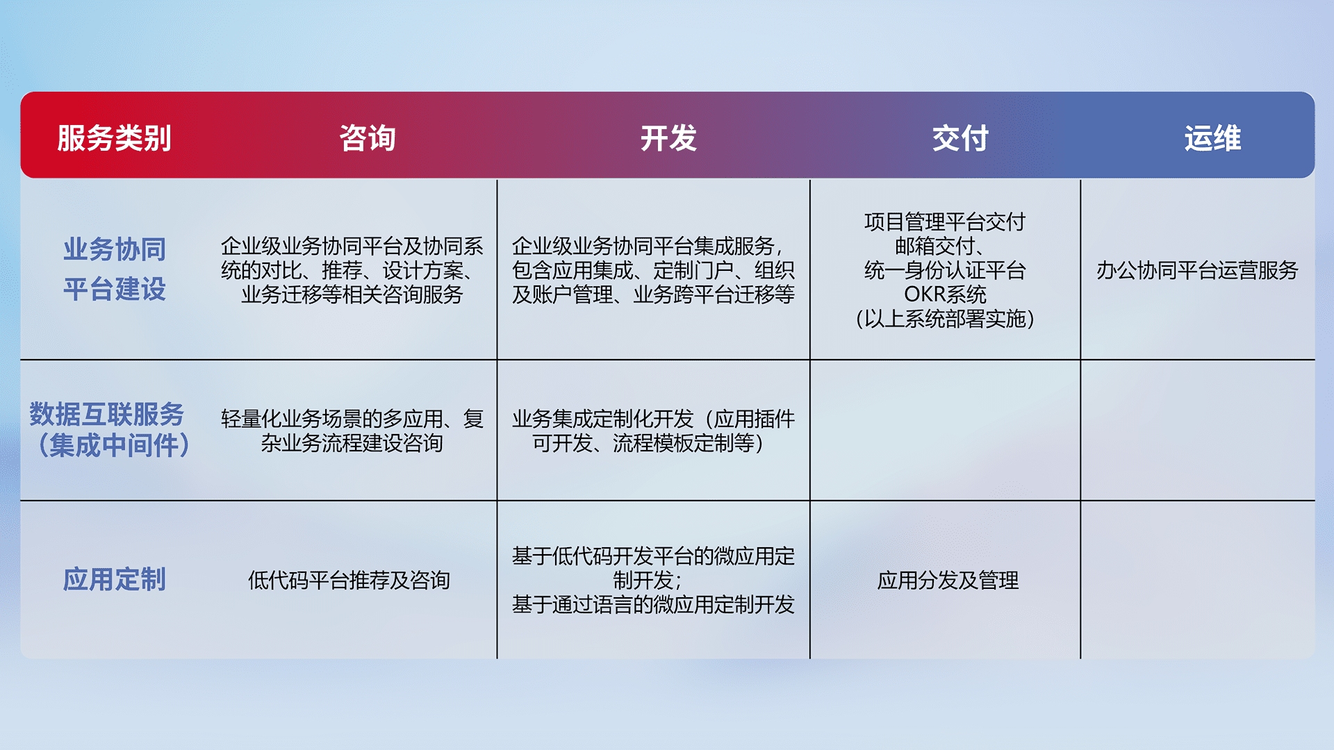 针对钉钉、、企微、、IDaas等平台级产品提供产品的规划、、、、方案、、、、交付、、定制化开发等服务,,,实现如统一协同办公、、智能客户服务、、、混合会议管理、、、、智能数据查询、、、等业务场景,,,实现数字化转型。。。